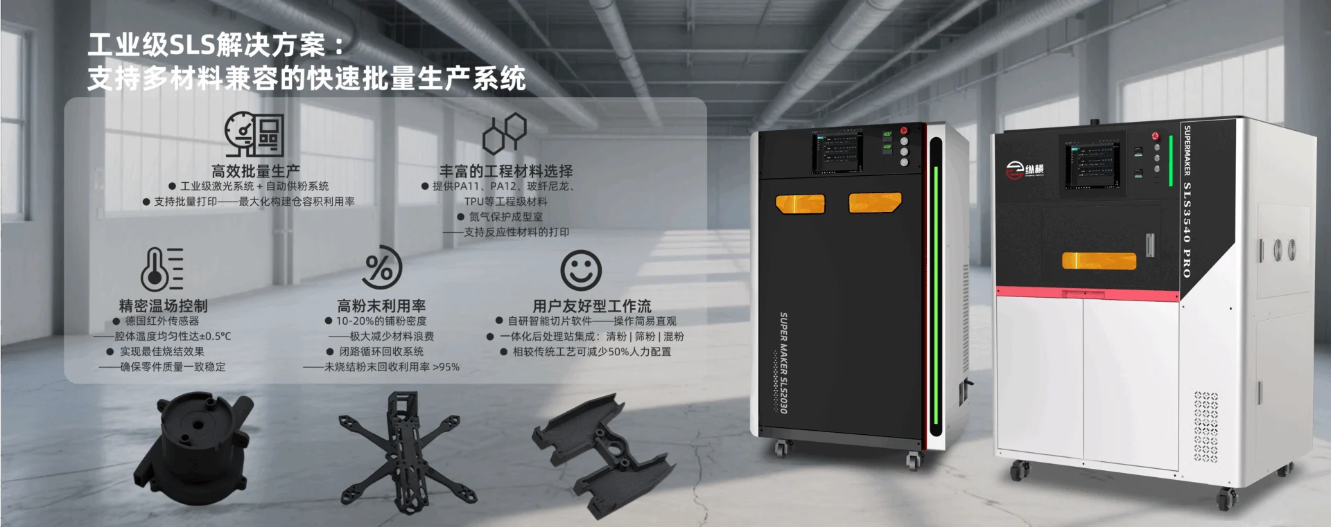纵横三维专注于制造高精度工业级SLA、DLP和SLS 3D打印机,并提供先进的光敏树脂及工程级粉末材料(PA11、PA12、TPU、尼龙-GF)。我们的3D打印系统具有微米级精度、高效生产能力和24/7持续运行的可靠性,全面满足航空航天、汽车制造、医疗器械及工业制造等领域的严苛需求。我们同时提供定制化3D打印解决方案——可根据客户的特殊需求,量身定制打印设备、开发专用材料并优化生产流程。从快速原型制作到终端零部件量产,纵横三维始终致力于通过领先的增材制造技术,为各行业客户提供强大技术支持。